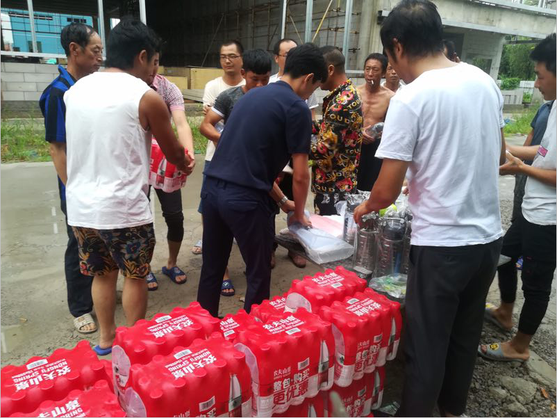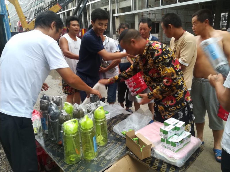 工程部主管攜手項目經理向現場施工工人發放慰問品,并致以關懷與慰問