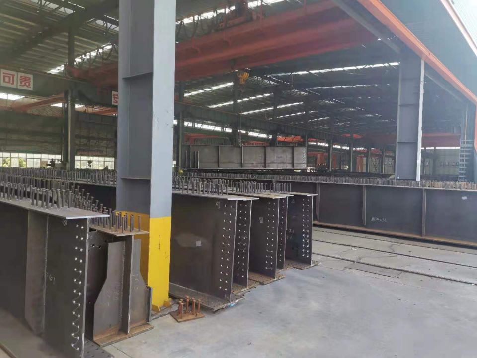 江北東高速公路是湖北省“十三五”綜合交通規劃重點建設項目之一,項目K4+267~K15+307段采用裝配式橋梁工業化建造技術。其中,項目洪湖1#特大橋、洪湖2#特大橋、汊河服務區特大橋、洪湖3#特大橋共4座橋梁上部結構設計為“工字型鋼+混凝土組合梁”,即鋼混組合梁,全長10km,共計1284榀,設計速度為100km/小時,雙向四車道。因施工工藝需要,鋼梁在我廠內制作成桿件;預制橋面板在江北東項目工業化橋梁PC構件廠生產。施工現場橋位處設置1、2#疊拼梁場進行鋼混組合梁疊拼和架設施工。工字型鋼梁按2片一榀,組拼并安裝榀內鋼橫撐,在鋼梁頂面疊合預制橋面板,澆筑橫向濕接縫,回灌剪力釘槽口內混凝土,形成單榀鋼混組合梁;除前三孔采用跨墩龍門吊吊裝外,其他組合梁利用運梁車將鋼混組合梁運輸至橋位提梁位置,采用兩臺125t跨墩龍門吊將組合梁吊運至橋面運梁車上,架橋機在前方逐孔架設,后方采用運梁車喂梁。架設完畢后安裝組合梁榀間鋼橫撐。